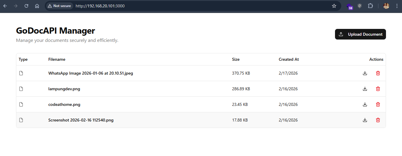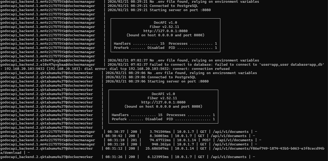 Secara keseluruhan, pada Part 1 ini kita telah berhasil membangun fondasi arsitektur High Availability menggunakan Docker Swarm dengan pendekatan yang menyerupai lingkungan produksi nyata. Dimulai dari inisialisasi cluster dengan pemisahan peran Manager dan Worker, kemudian memisahkan application layer (frontend dan backend) dari data layer (PostgreSQL dan RustFS di Server C), hingga melakukan deployment menggunakan docker-stack.yaml dengan konfigurasi replication, overlay network, dan rolling update. Aplikasi yang bersumber dari repository GoDocAPI dan frontend-GoDocAPI kini berjalan secara terdistribusi, memiliki kemampuan self-healing, load balancing internal melalui routing mesh, serta siap untuk scaling horizontal. Dengan fondasi ini, cluster sudah memenuhi prinsip dasar sistem terdistribusi yang resilien dan siap dikembangkan lebih lanjut pada tahap optimasi dan hardening di bagian berikutnya.
